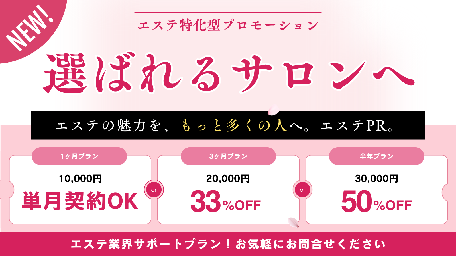 | 【6ヶ月プラン】 | 30,000円 | ・6ヶ月契約/都度更新制 ・月あたり 約5000円(50%OFF) ・長期PRにおすすめ! |